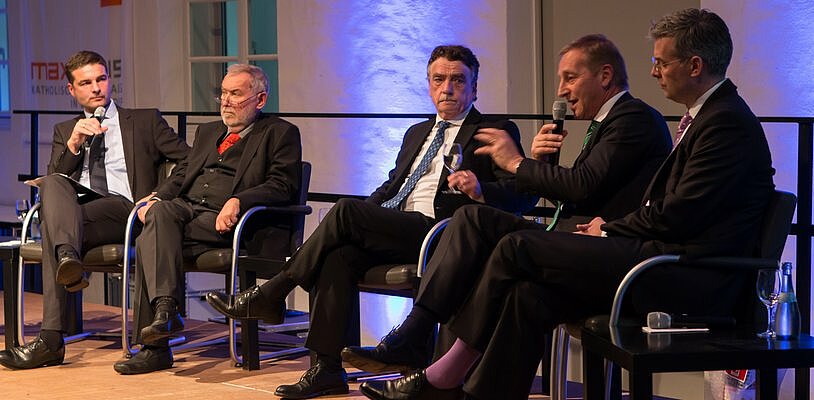 Höhepunkt des Abends im Düsseldorfer Maxhaus war eine Podiumsdiskussion. Hier diskutierten die Spitzenvertreter von Haus & Grund, dem Deutschen Mieterbund und dem BFW mit dem Minister darüber, wie bezahlbares Wohnen für alle zu schaffen ist. Das öffentliche Interesse an diesem Thema ist groß – der Klosterhof des Maxhauses war bis auf den letzten Platz gefüllt.