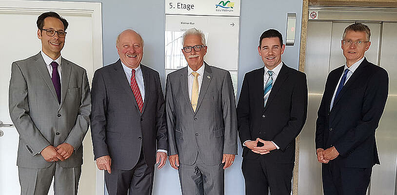 Am 13. Juni, zum 104. Geburtstag des Rheinisch-Westfälischen Landesverbandes, trafen sich Haus & Grund Rheinland Westfalen und der Landkreistag NRW zu einem Gespräch in angenehmer Atmosphäre in Mettmann. Der Präsident des Landkreistages NRW Thomas Hendele (CDU) ist zugleich auch seit 20 Jahren Landrat des Kreises Mettmann. Mit dabei war der Erste Beigeordnete des Landkreistages NRW, Dr. Marco Kuhn. Der Landesverband Haus & Grund Rheinland Westfalen war vertreten durch seinen Präsidenten Konrad Adenauer, den Vizepräsidenten Dr. Johann Werner Fliescher und den Verbandsdirektor Erik Uwe Amaya.