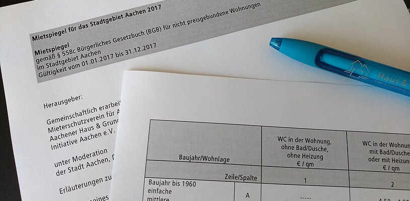 In gemeinschaftlicher Beratung und Zusammenarbeit haben der Mieterschutzverein Aachen, der Aachener Haus & Grundbesitzerverein und die Initiative-Aachen unter Moderation der Stadt Aachen, Fachbereich Wohnen, Soziales und Integration, den Mietspiegel für frei finanzierte Wohnungen im Stadtgebiet Aachen für die Zeit vom 01.01.2017 bis 31.12.2017 vereinbart.