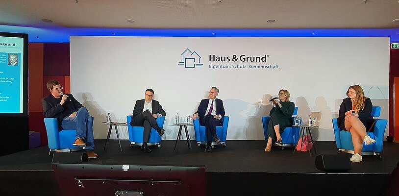 Die Frage, ob der Klimaschutz das Wohnen unbezahlbar mache, diskutierte der Verband mit dem Parlamentarischen Staatssekretär aus dem Bundesbauministerium, Sören Bartol (SPD), sowie den Abgeordneten Julia Klöckner (CDU), Christina-Johanne Schröder (Bündnis 90/Die Grünen) sowie Lukas Köhler (FDP). Warnecke betonte dabei, dass das Ob der Energiewende nicht in Zweifel gezogen werden dürfe, aber das Wie neu debattiert werden müsse. Die aktuellen Pläne seien nicht zu finanzieren und gänzlich praxisfern. Die Bundesregierung müsse erst die Grundlagen wie eine kommunale Wärmeplanung und individuelle Sanierungsfahrpläne auf den Weg bringen, bevor die Eigentümer handeln könnten.